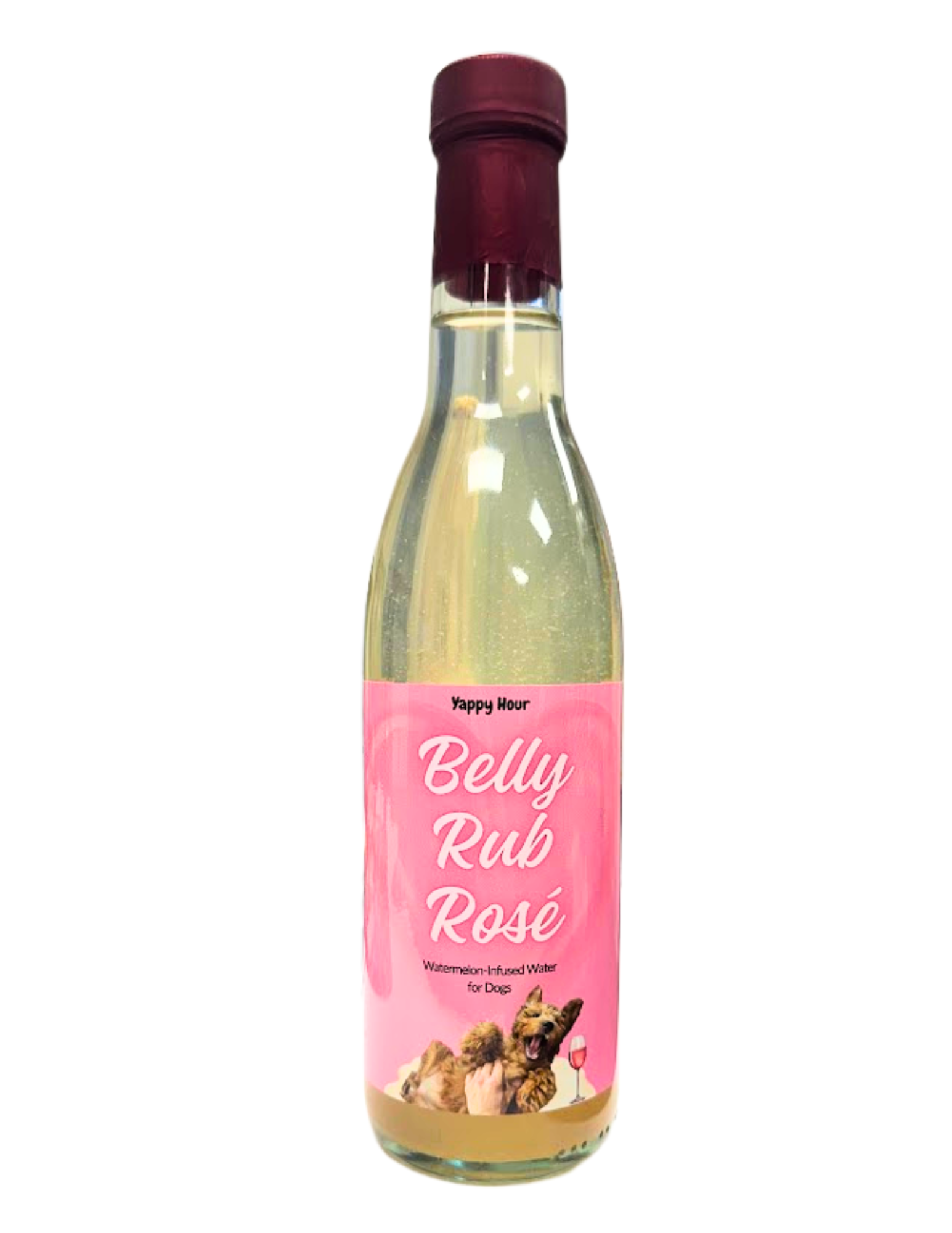 Belly Rub Rosé is watermelon-infused water made for dogs packaged up in a cute wine bottle. The pink color and very light watermelon flavor make it a crowd favorite from the Yappy Hour collection of dog booze.