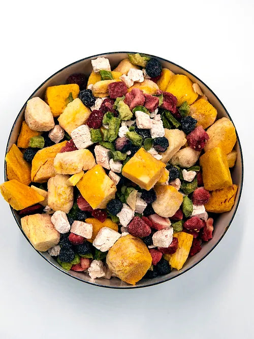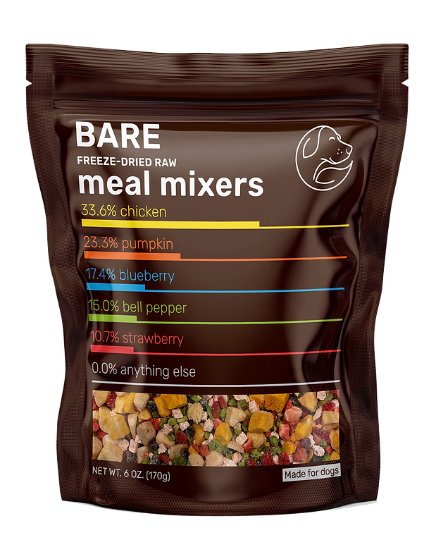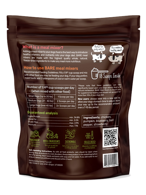 The Bare classic. Mix into or add as a topper to your dogs daily meals. Contains only 5 ingredients: chicken, pumpkin, blueberry, bell pepper, & strawberry. Approximately eighteen 1/4 cup scoops inside.