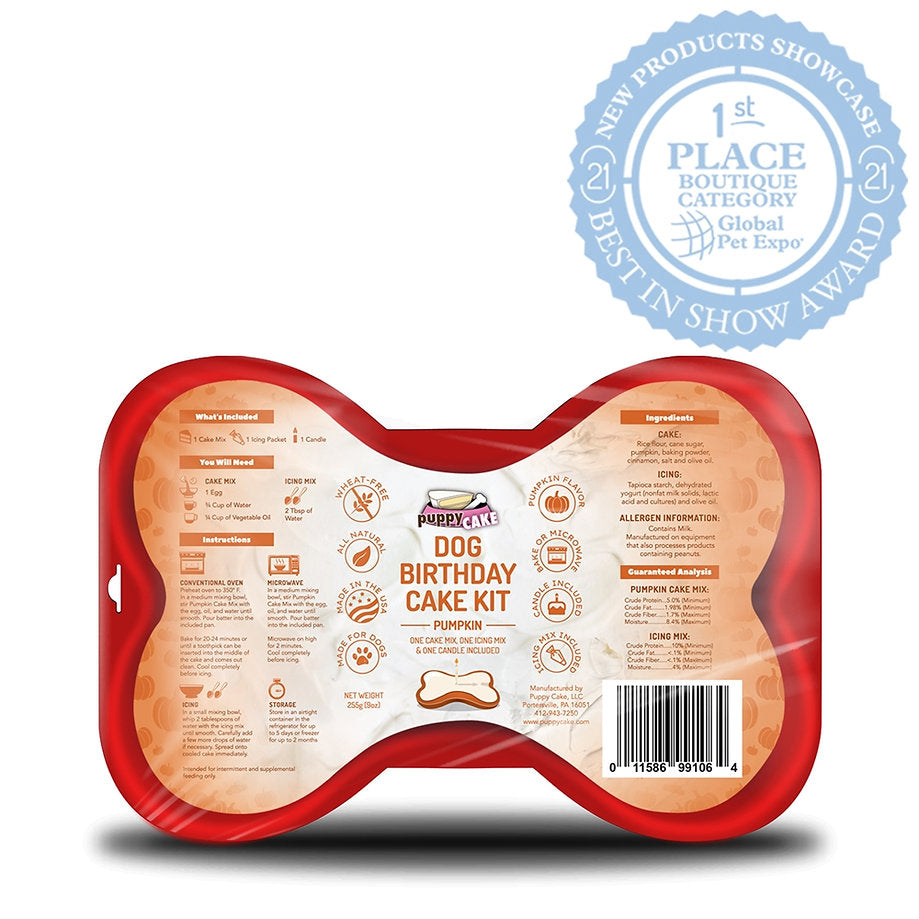 We know humans love Pumpkin Spice lattes and now your pooch can enjoy their own decadent treat inspired by this popular flavor! Our cake mixes result in a light, fluffy and moist cake for your dog to enjoy. We believe that our furry friends should be celebrated in style, which is why we wanted to create healthy cakes you can make at home. These dog cake kits come complete with icing so you can have a dog bakery at home! Fed in moderation, Puppy Cake is a fun and healthy supplement to your dog’s diet. Any time is the right time to celebrate with cake.