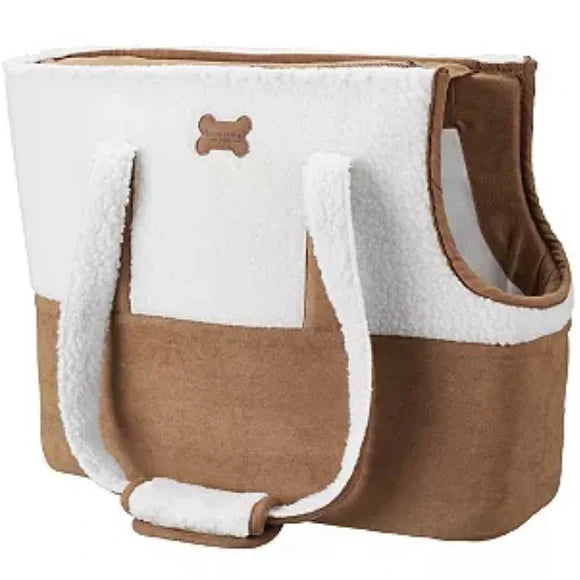 - Made with a soft faux suede and cozy sherpa for the most comfortable carrying of mans best friend. The bag has a scoop in the front for the most comfort for your animal.