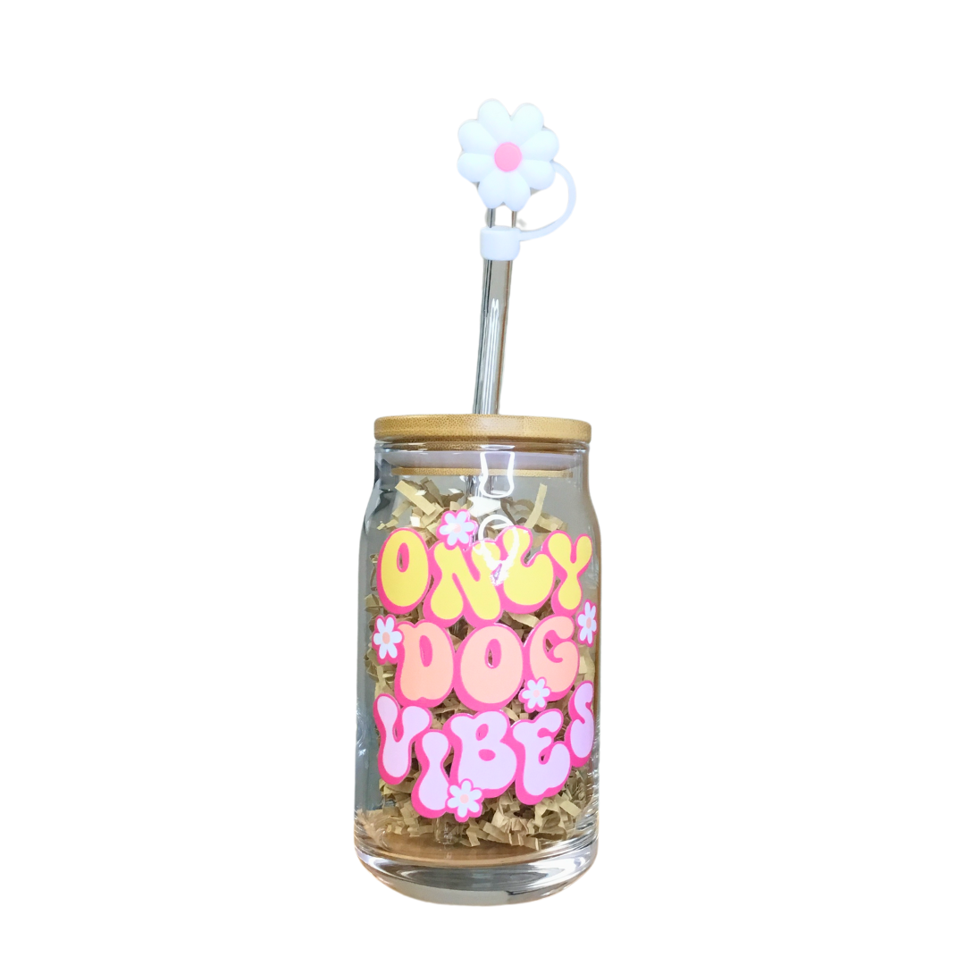 🐾 Only Dog Vibes Glass Can Cup – With Lid, Straw & Topper | 16 oz