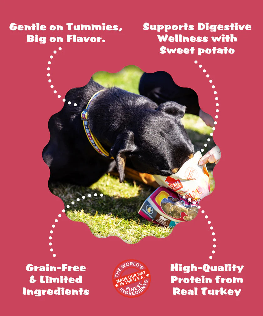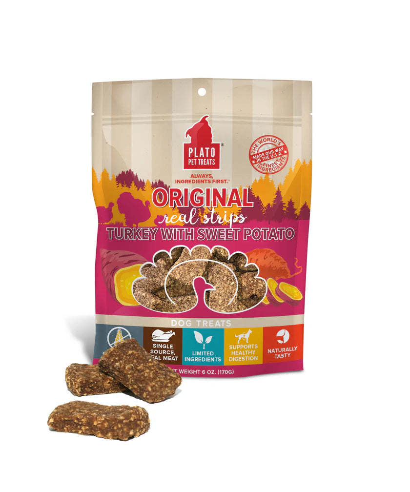 Real Strips Grain Free Turkey with Sweet Potato are meat bars that support healthy digestion and are just the right portion size and shape for chomping.
