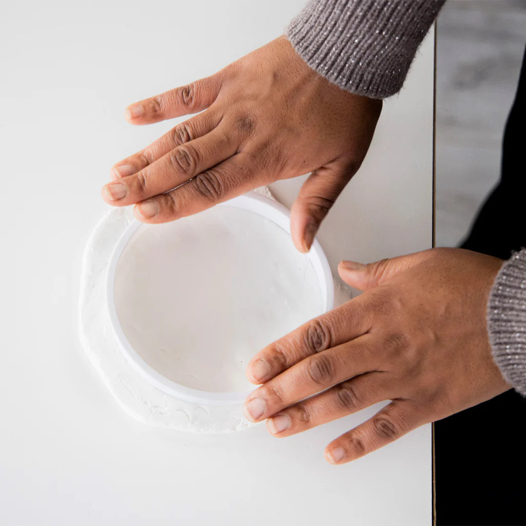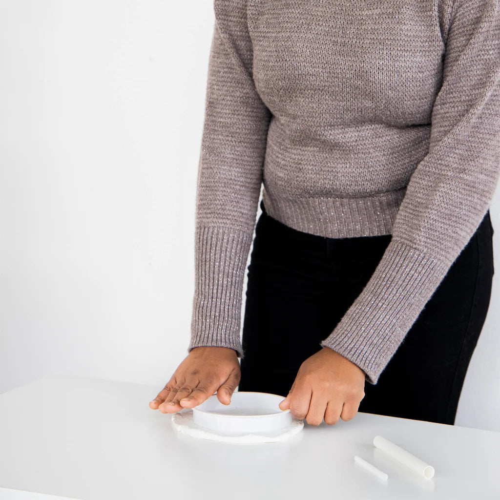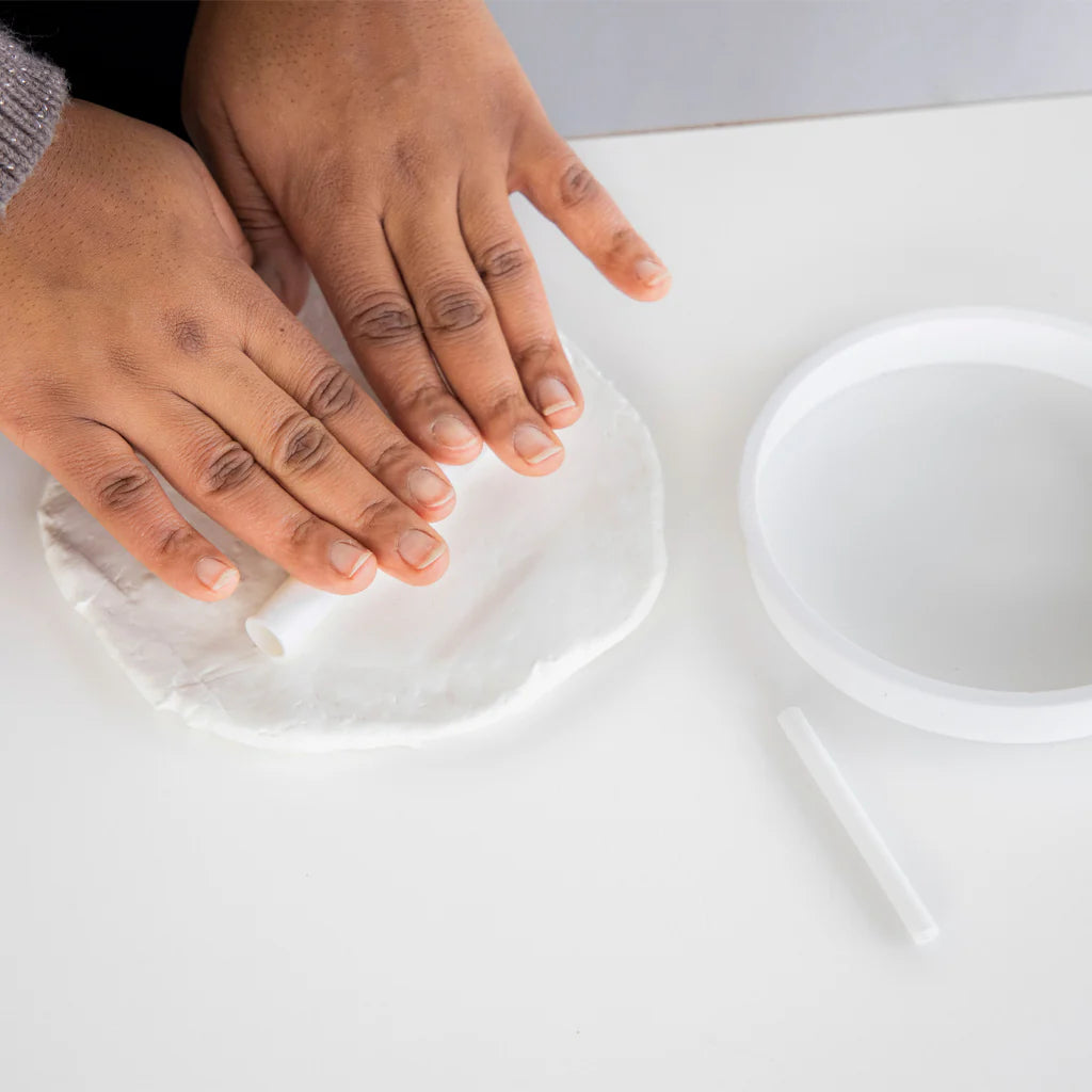 Includes 1 plastic shaping ring, 1 package of air-drying clay, rolling pin, plastic hole punch, and 1 red grosgrain ribbon