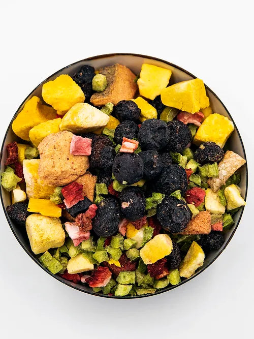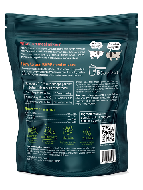 The hometown (and every town) favorite. Mix into or add as a topper to your dogs daily meals. Contains only 5 ingredients: salmon, pumpkin, blueberry, bell pepper, & strawberry. Approximately eighteen 1/4 cup scoops inside.